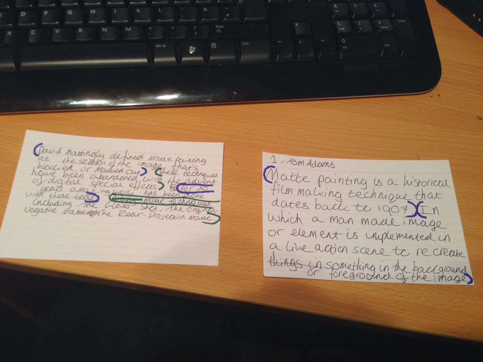 Matte Painting is a historic Film Making technique which dates back to 1907. Matte Painting has many forms including The Glass Shot, the Original Negative Matte and The Projection Matte. In which a man made element is planted in an live action scene to re-create something in an image. For 80 years amazing things have been created using these techniques.